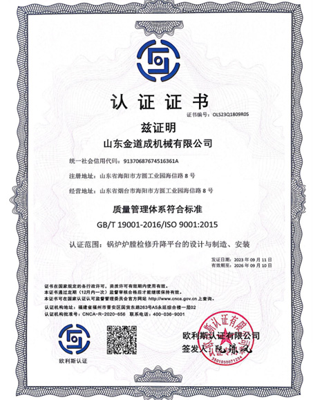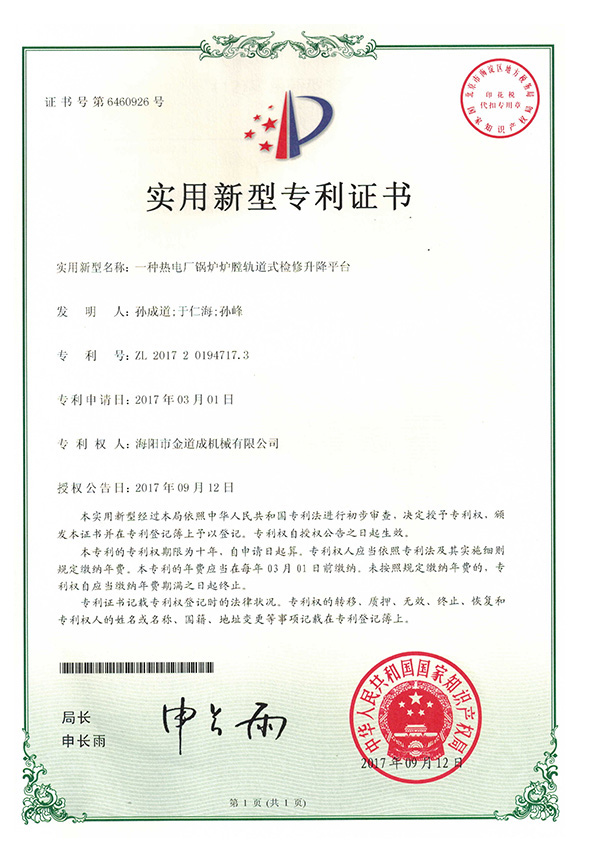 部件采用模块化设计成满膛结构,淘汰回型结构镂空的空缺(工作走台满膛平铺无盲区);去掉折叠平台走台上的斜拉索,设计成下撑杆式的折叠走台,极大地方便了工作走台上的人员无障碍行走。循环流化床锅炉可以直接在炉底风帽上组装完成,煤粉锅炉可以在运转层检修人孔以下0.5米左右的标高位置安装(可配套设置冷灰斗专用的我公司专利产品:煤粉锅炉灰口支撑平台),把检修升降平台由运转层平台人孔门运进炉内,直接在搭设好的灰口支撑平台上组装。